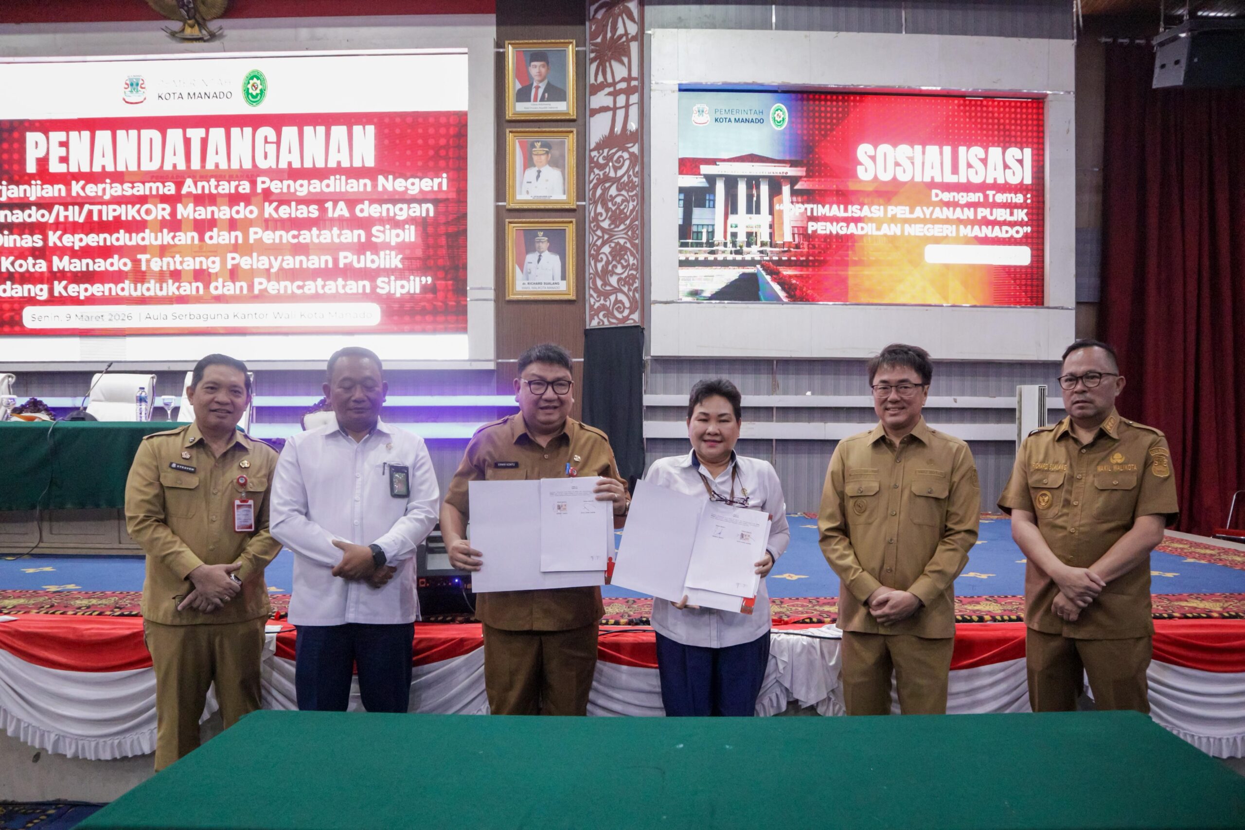 Pemerintah Kota Manado bekerja sama dengan Pengadilan Negeri Manado menggelar kegiatan sosialisasi bertema “Optimalisasi Pelayanan Publik Pengadilan Negeri Manado” yang dilaksanakan di Aula Serbaguna Kantor Wali Kota Manado, Senin (9/3/2026).